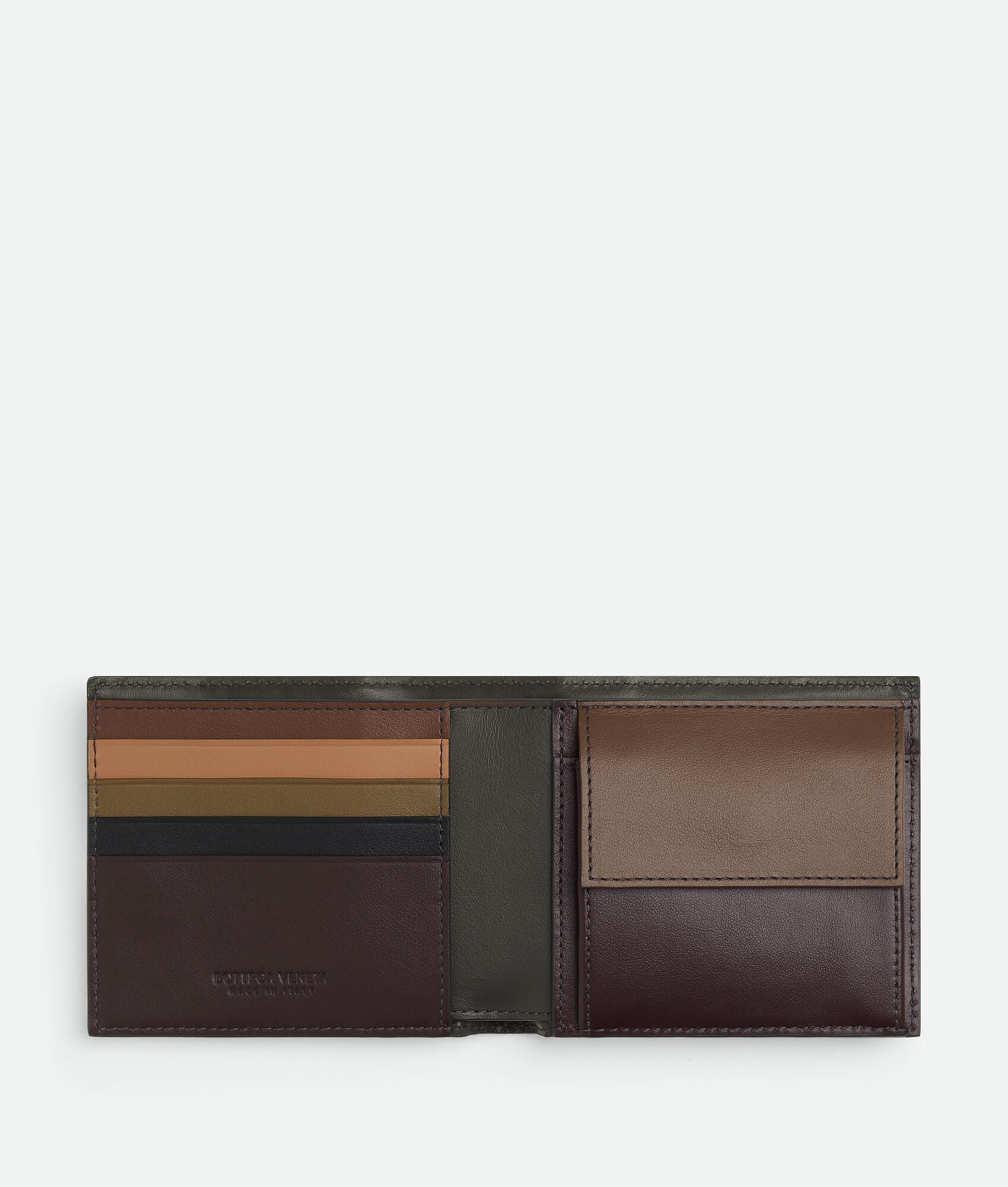 Bi-fold wallet in Intrecciato calf leather with coin purse and multicolour interior.
