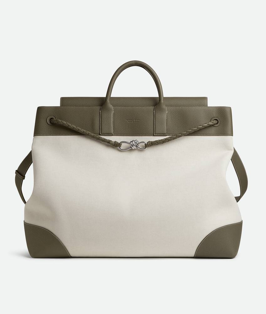 Maxi weekender in canvas and grained leather with signature knot detail featuring an adjustable and detachable cross-body strap.