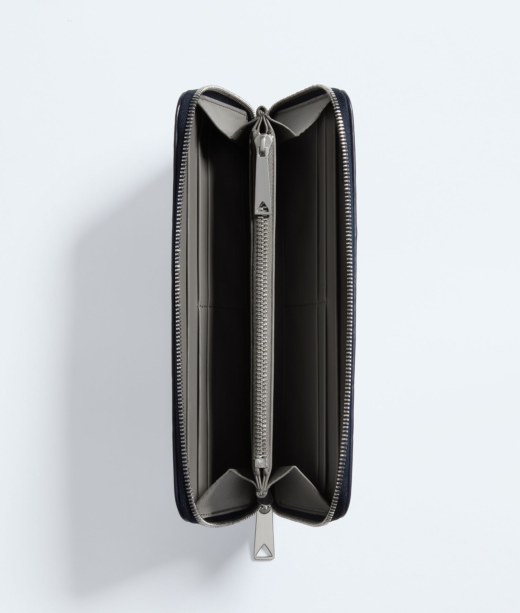 Zip-around wallet in Intrecciato calf leather with contrasted interior.