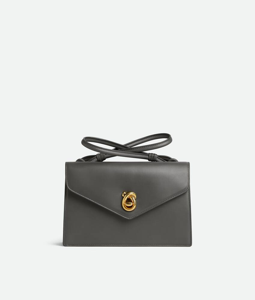 조형적인 놋 잠금장치와 엮은 디자인의 탑 핸들을 갖춘 부드러운 송아지가죽 소재의 숄더 백.