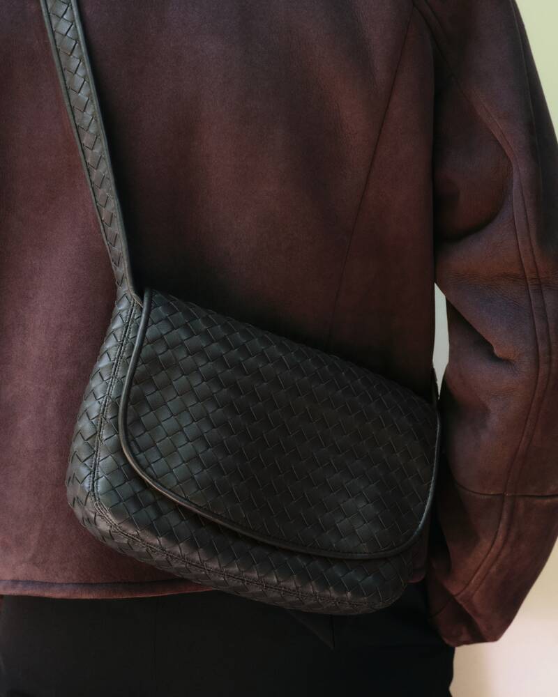 시그니처 놋 디테일과 길이 조절 및 탈착 가능한 크로스 스트랩을 갖춘 인트레치아토 가죽 소재의 메신저 백.